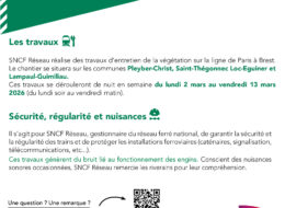 SNCF Réseau réalise des travaux, le long de la voie ferrée, sur la commune. Ces travaux se dérouleront de nuit en semaine du lundi 2 mars au vendredi 13 mars. Ces travaux génèrent du bruit lié au fonctionnement des engins. Conscient des nuisances sonores occasionnées,......