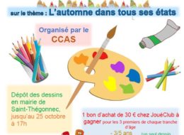 Thème : L’automne dans tous ses états Les participants seront classés en 3 catégories en fonction de leur âge : 3/5 ans, 6/8 ans et 9/11 ans. Un seul dessin par enfant sera accepté. Les 3 premiers de chaque tranche d’âge recevront un bon d’achat de 30 €...