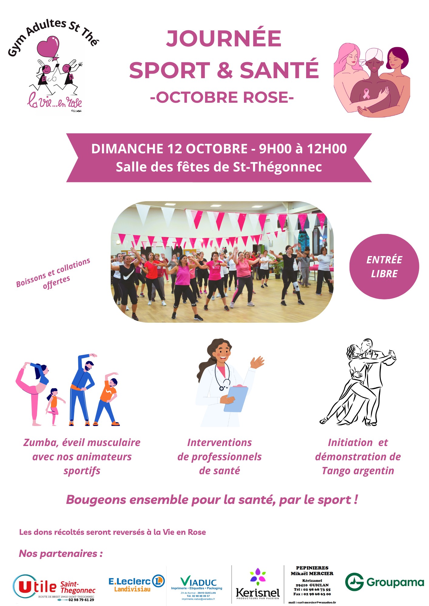 GYM ADULTES SAINT-THÉ • OCTOBRE ROSE Dimanche 12 octobre de 9h à 12h • Salle des fêtes Programme des animations : • 9h : Éveil musculaire avec Yannick Thomas • 9h30 : Sport & santé avec Dr Mallauran, spécialiste en médecine physique et de réadaptation, au centre de Perharidy. •...
