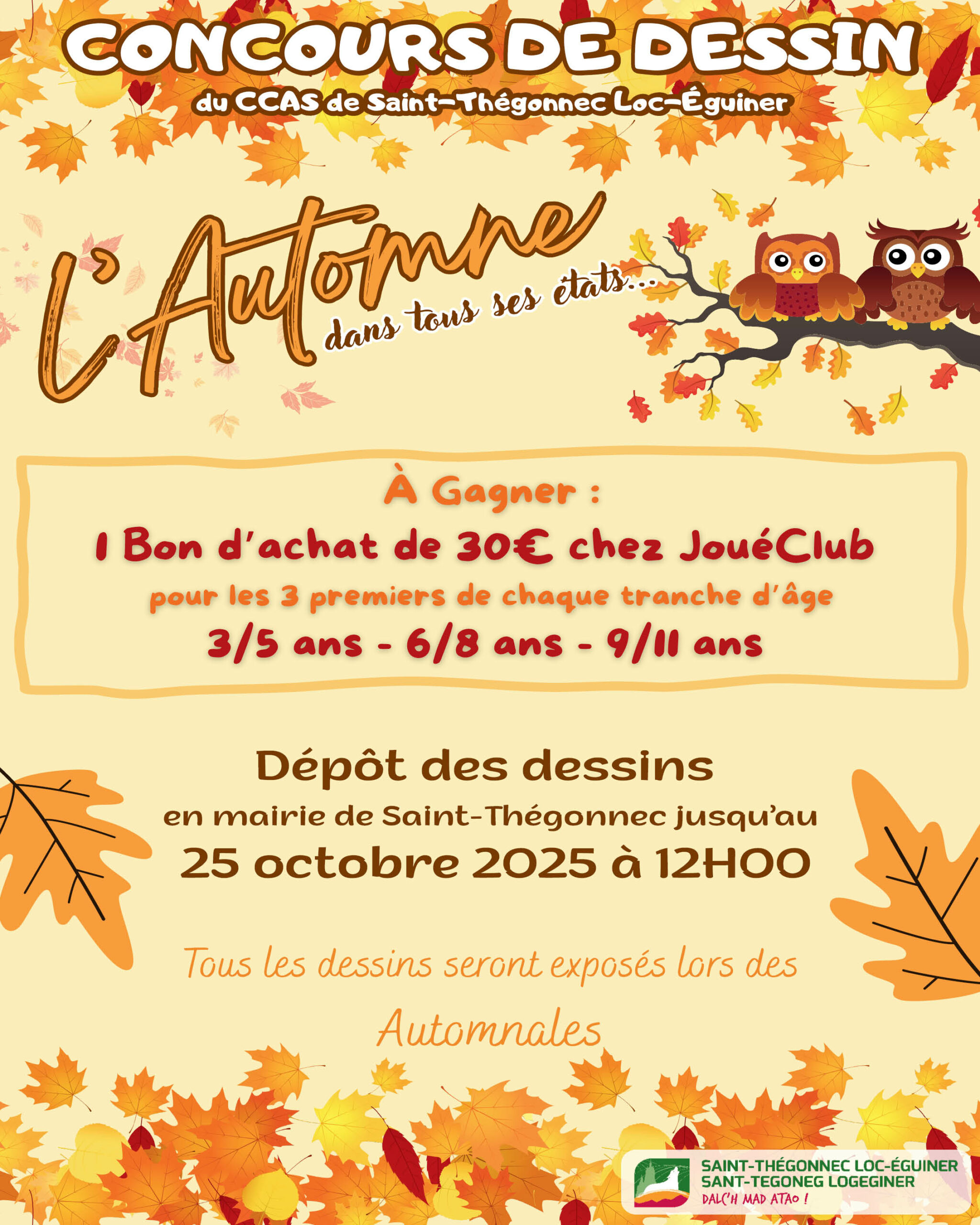 Thème : l’automne dans tous ses états 3 catégories en fonction de l’âge : 3/5 ans, 6/8 ans et 9/11 ans. Un seul dessin par enfant sera accepté. Les 3 premiers de chaque tranche d’âge recevront un bon d’achat de 30 € chez JouéClub. Les dessins sont à déposer en mairie...