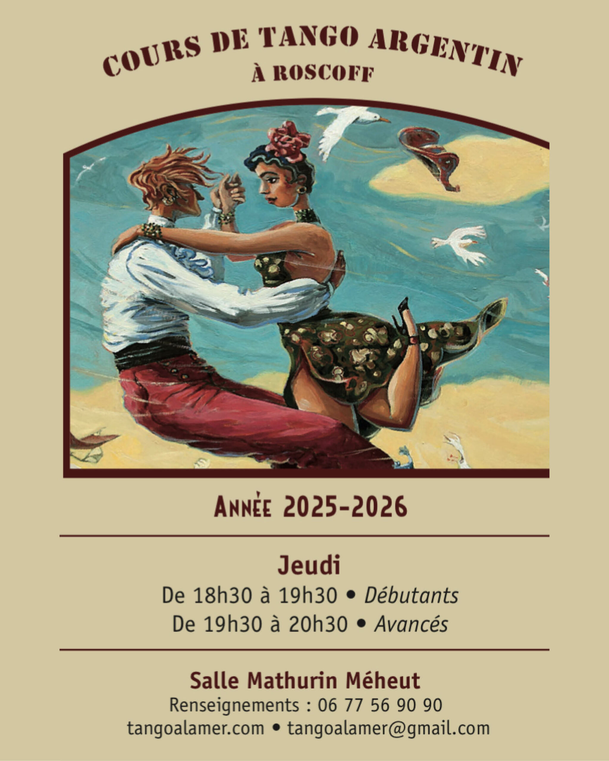Cours de danse de tango, salle Mathurin Meheut à Roscoff, par l’association Tango à la Mer. Cours le jeudi de 18h30 à 19h30. Possibilité de covoiturage au départ de Saint-Thé Loc. Adhésion annuelle 15 € - Cours 6 € / personne - Carte de 10 cours non...
